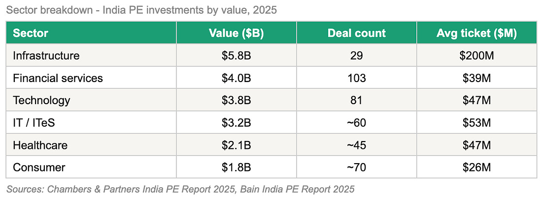 What 2025 actually looked likeThe headline number depends on who’s counting. Equirus Capital tracked 1,761 PE/VC deals between January and November 2025. A 10-year high in volume terms, surpassing even the 2021 peak. But aggregate deal counts include everything from seed-stage VC to large buyouts. When you isolate pure-play PE, the story is different. Deal concentration was the defining theme. Average deal size grew from $34.4 million in 2024 to $41.6 million in 2025. Buyouts alone just 26 transactions accounted for $6.2 billion, averaging roughly $240 million per deal. Mid-market deals in the $10–50 million range expanded from under 20% of deal count in 2020 to over 40% in 2025. The exit environment told the same story. The number of exits fell 53% in 2025. Exit value fell only 15%. Trade sales strategic acquirers buying PE-backed companies surged 154% in value. Investors weren’t rushing out. They were waiting for the right door, and holding longer to find it. Where the money actually wentSector allocation in 2025 showed a clear hierarchy. Infrastructure led on ticket size is $5.8 billion across just 29 deals reflecting patient, long-duration capital going into roads, power, and data infrastructure. Financial services came second at $4 billion across 103 deals, driven by affordable housing finance, loan against property, and MSME lending. Technology sat at $3.8 billion across 81 deals. The surprises were elsewhere. IT and ITeS investments surged approximately 300%, driven by major deals like Perficient and Altimetrik alongside a wave of revenue cycle management investments. Healthcare deal volumes rose roughly 80%, led by medtech transactions and pharma CDMO plays. These are not glamorous consumer-facing bets these are operational businesses with defensible revenue models and global demand tailwinds. Global funds recalibrated alongside domestic ones. KKR committed up to $310 million into PMI Electro Mobility an Indian electric commercial vehicles company emblematic of the new thesis: infrastructure-adjacent, energy transition, long-duration. PwC’s 2026 M&A outlook found that more than one-third of capital from newly raised Asian PE funds is now being directed toward India.