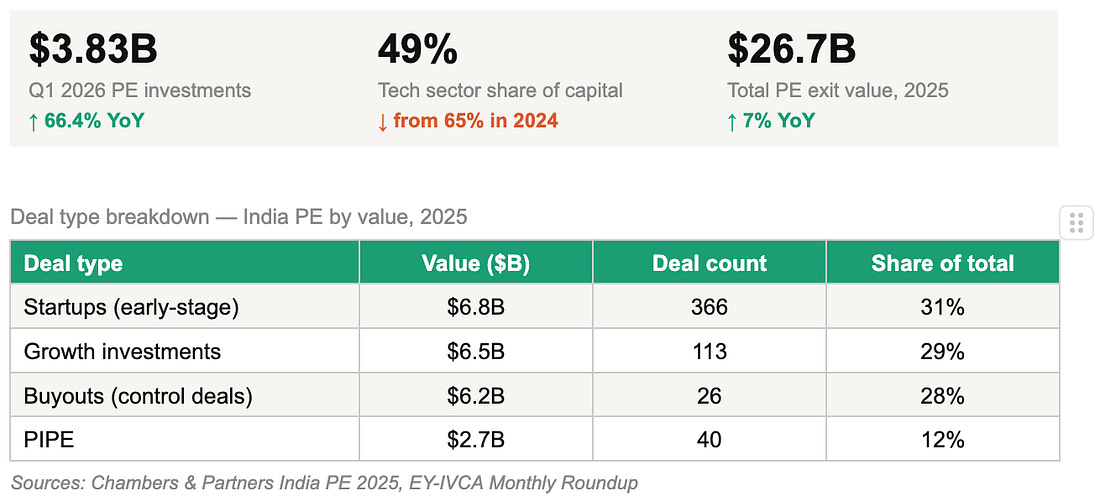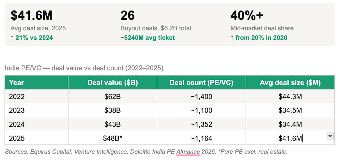 Domestic capital formation of this scale tells you something: India’s LP base is growing up alongside its GP base. The money isn’t just coming from outside anymore.
